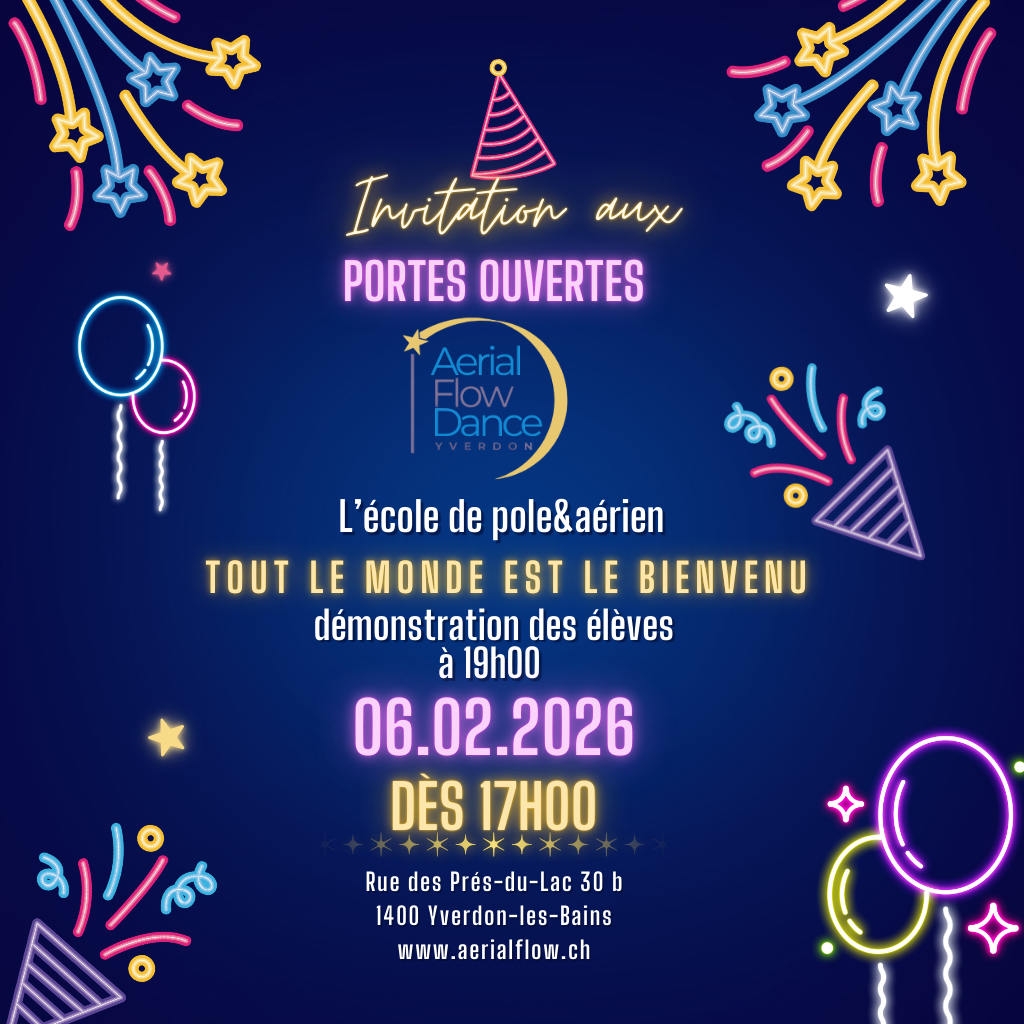 Aerial Flow Dance Yverdon vous invite à découvrir son monde aérien et ses activités. Venez pour prendre un apéro à partir de 17h00 et regarder la démonstration préparée par nos élèves à partir de 19h00. Tout au long de la soirée une tombola organisée par l’école vous permettra de tenter de gagner un bon cadeau d’une valeur de 50 francs – pensez à prévoir un peu de monnaie si vous souhaitez y participer.